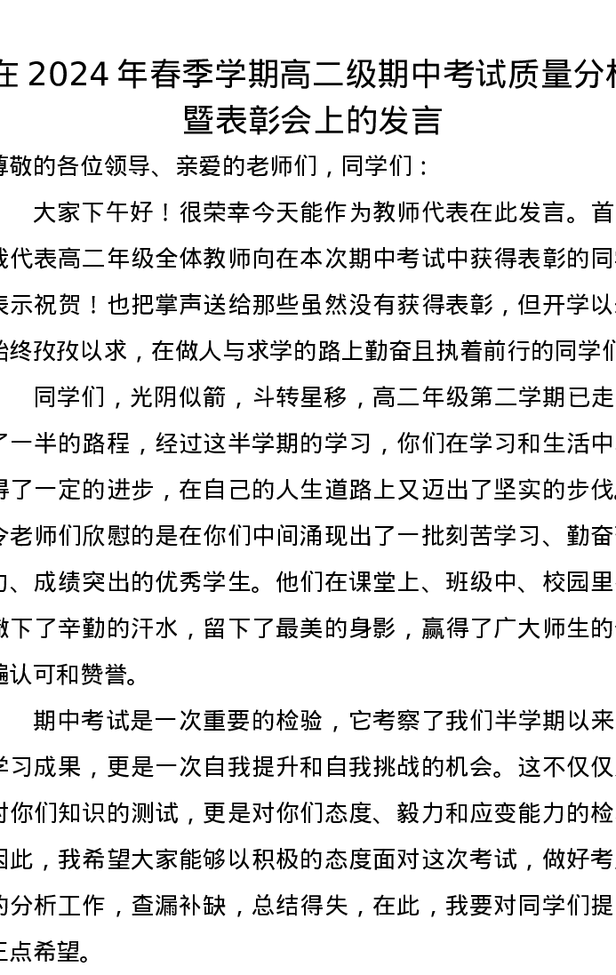 在2024年春季学期高二级期中考试质量分析暨表彰会上的发言