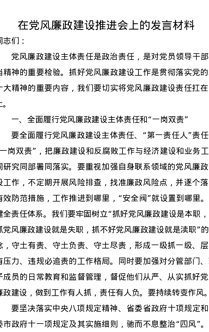 在党风廉政建设推进会上的发言材料