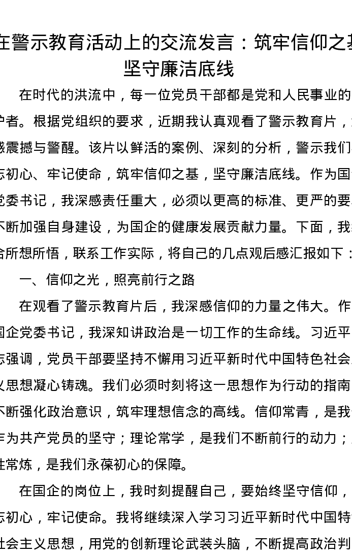 在警示教育活动上的交流发言:筑牢信仰之基,坚守廉洁底线