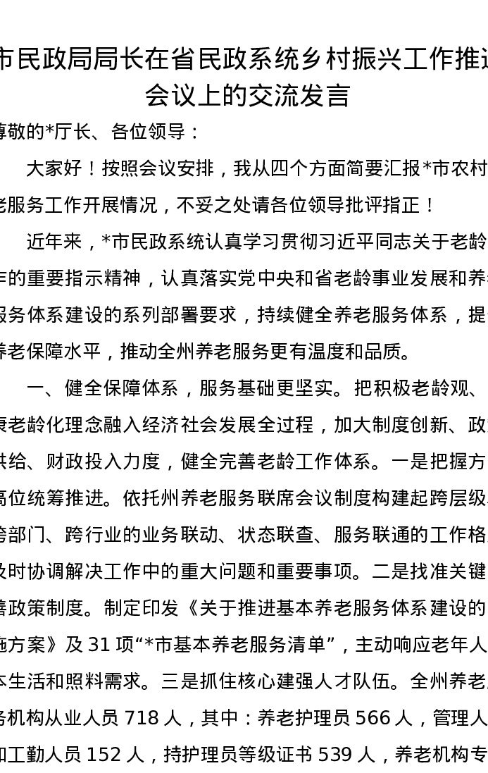 市民政局局长在省民政系统乡村振兴工作推进会议上的交流发言
