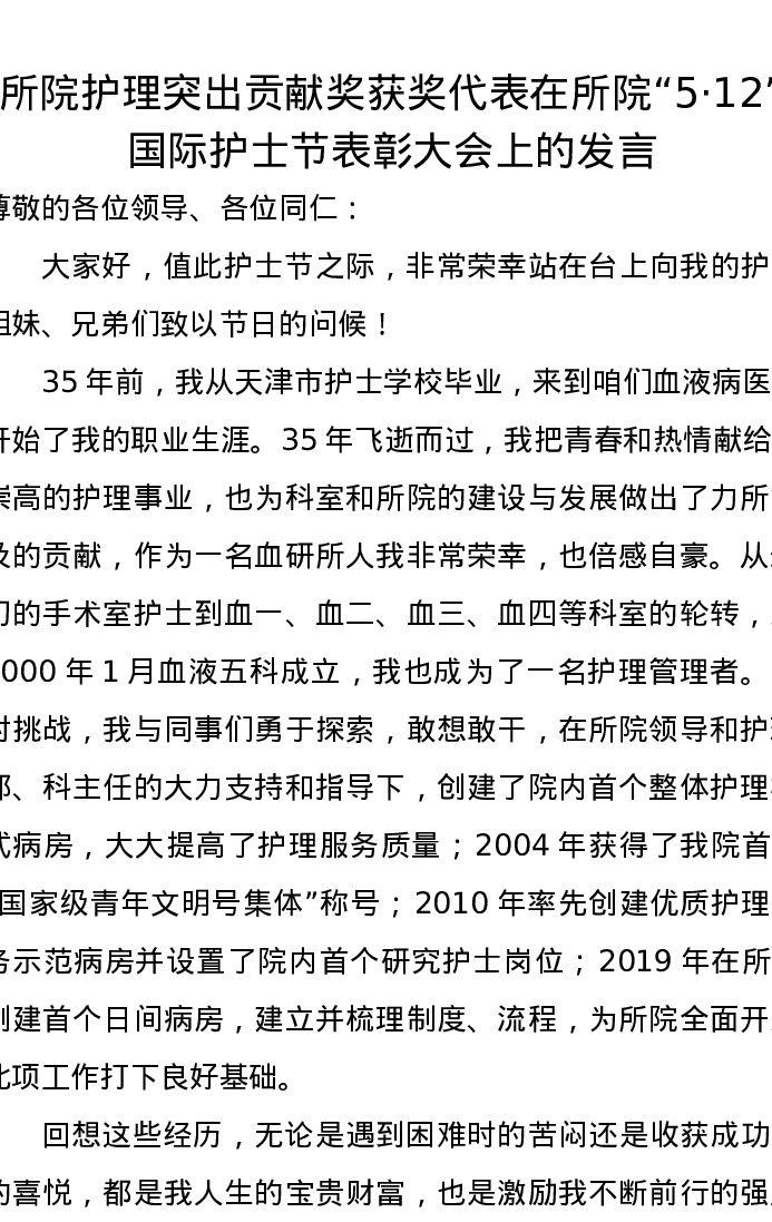 所院护理突出贡献奖获奖代表在所院“5·12”国际护士节表彰大会上的发言