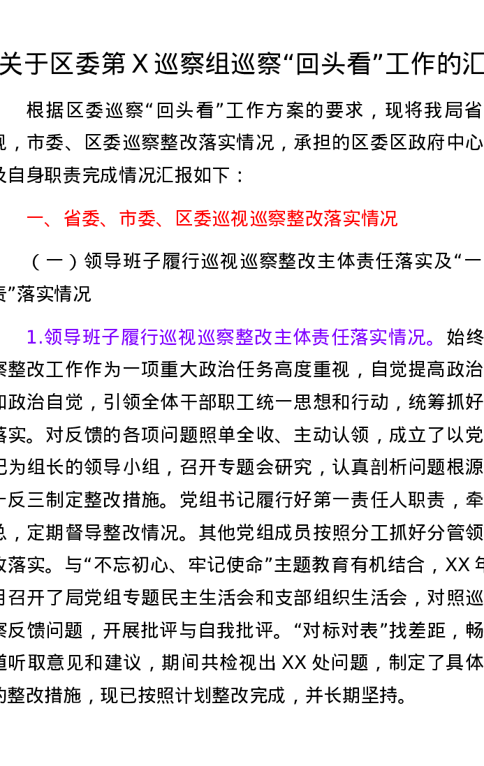 关于区委第X巡察组巡察“回头看”工作的汇报