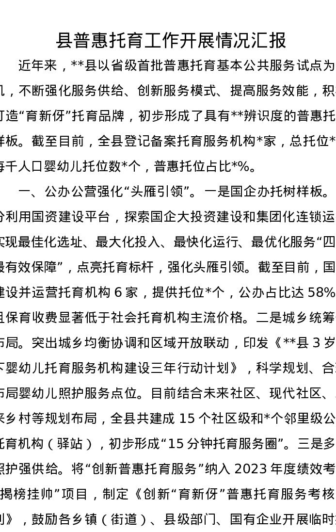 县普惠托育工作开展情况汇报