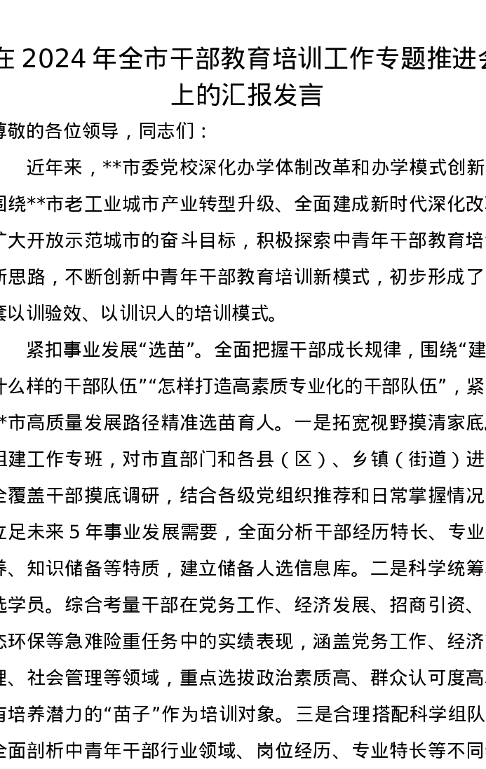 在2024年全市干部教育培训工作专题推进会上的汇报发言