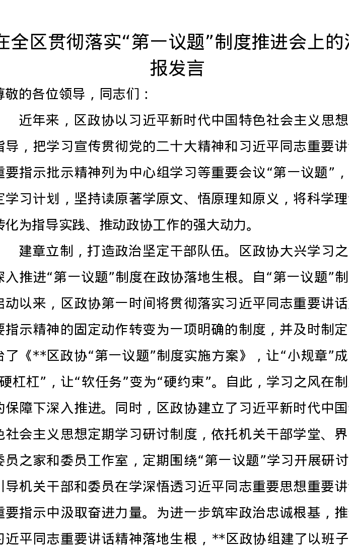 在全区贯彻落实“第一议题”制度推进会上的汇报发言