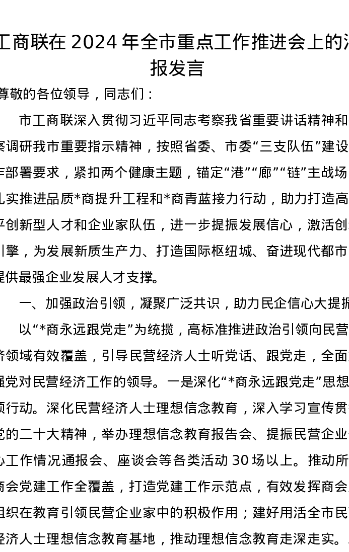 工商联在2024年全市重点工作推进会上的汇报发言