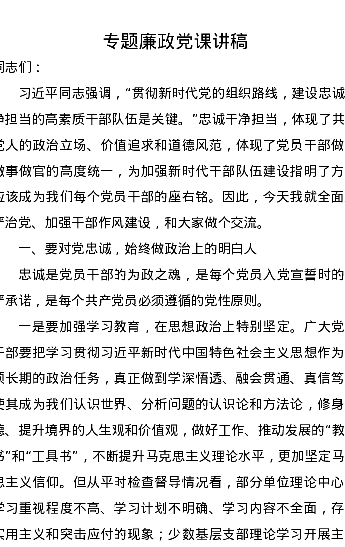 专题廉政党课讲稿