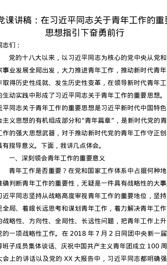 党课讲稿:在习近平总书记关于青年工作的重要思想指引下奋勇前行