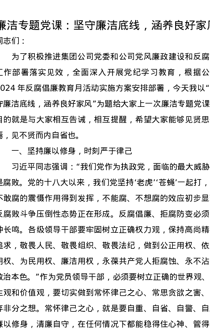 廉洁专题党课讲稿:坚守廉洁底线,涵养良好家风