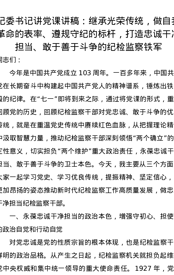 纪委书记讲党课讲稿:继承光荣传统,做自我革命的表率、遵规守纪的标杆,打造忠诚干净担当、敢于善于斗争的纪检监察铁军