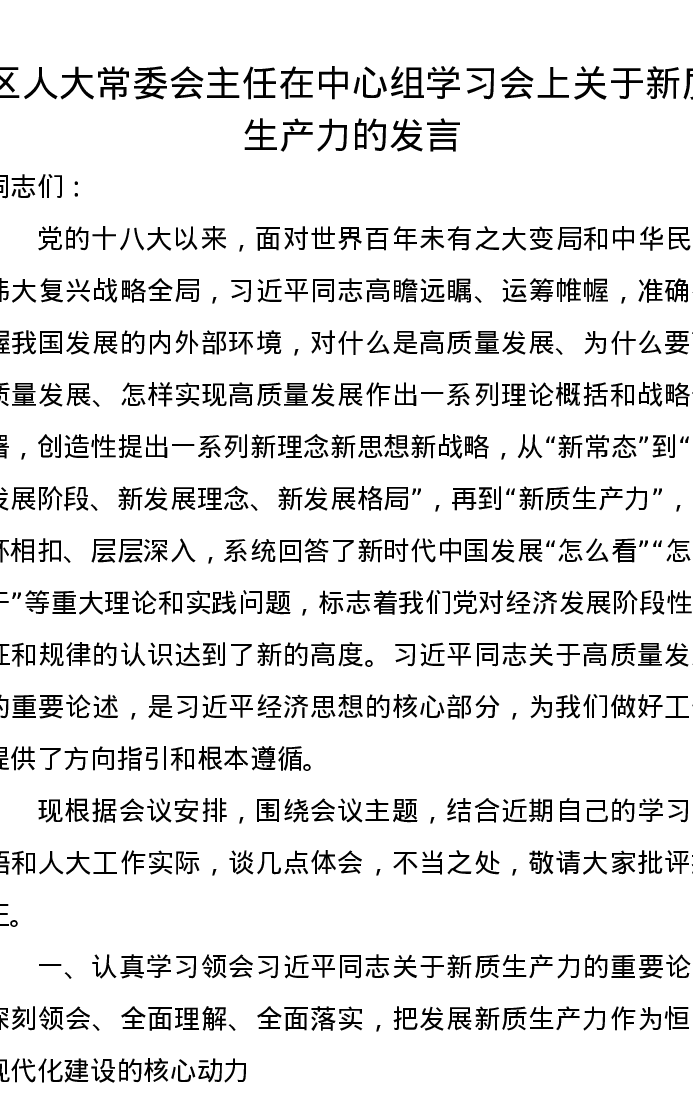 区人大常委会主任在中心组学习会上关于新质生产力的发言