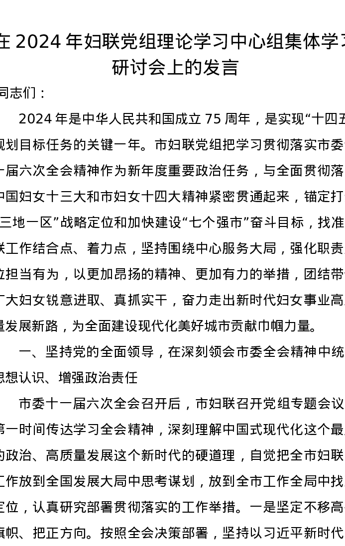 在2024年妇联党组理论学习中心组集体学习研讨会上的发言