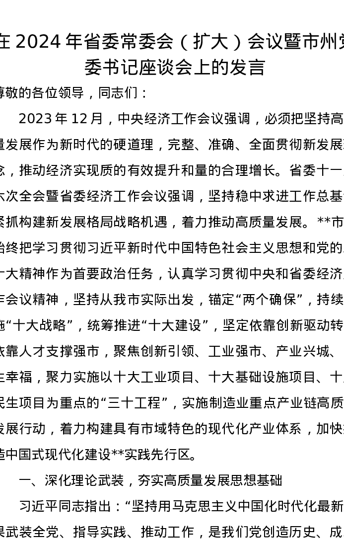 在2024年省委常委会(扩大)会议暨市州党委书记座谈会上的发言