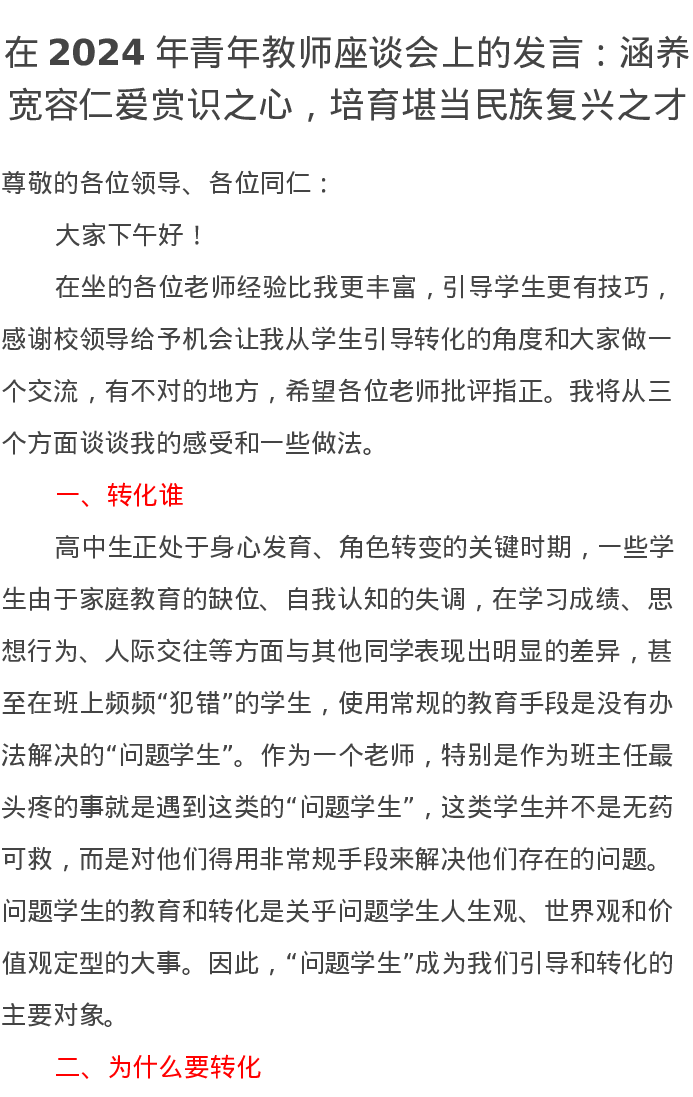 在2024年青年教师座谈会上的发言:涵养宽容仁爱赏识之心,培育堪当民族复兴之才