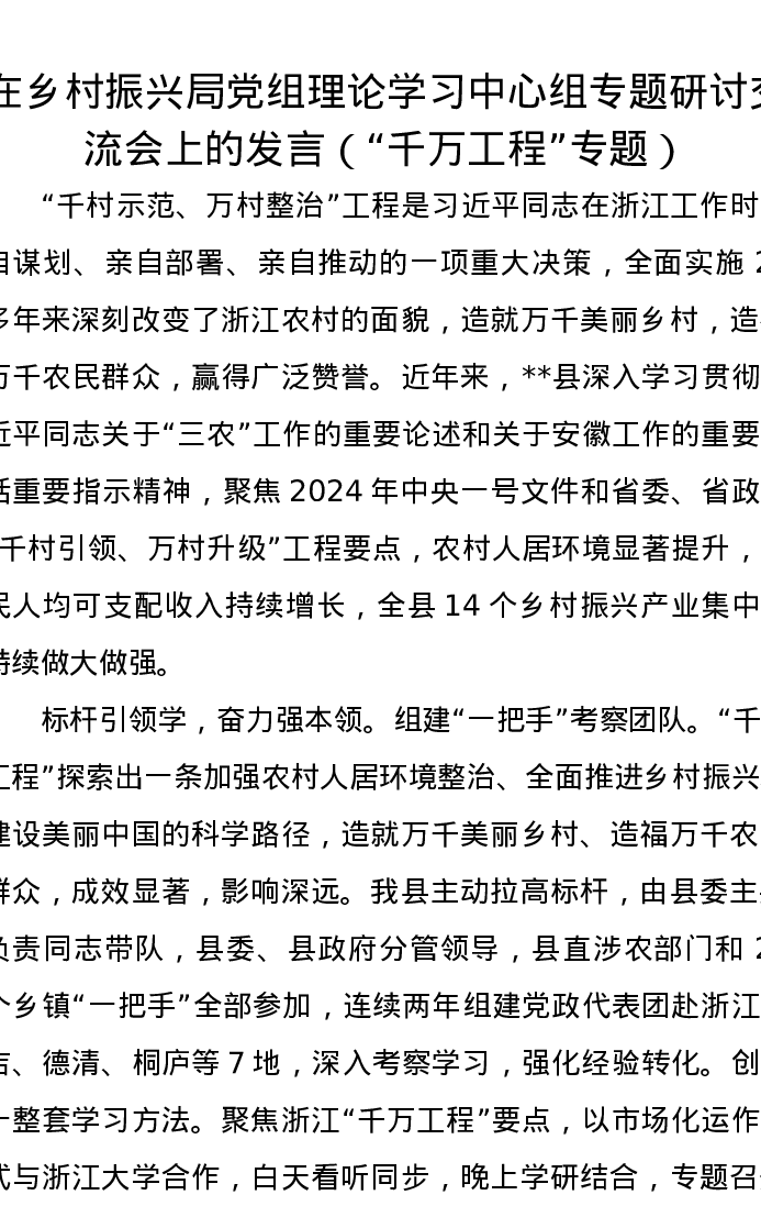 在乡村振兴局党组理论学习中心组专题研讨交流会上的发言(“千万工程”专题)