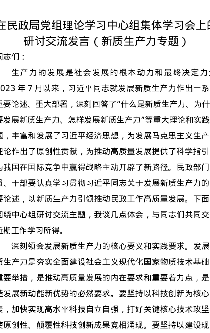 在民政局党组理论学习中心组集体学习会上的研讨交流发言(新质生产力专题)
