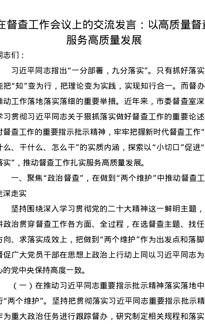 在督查工作会议上的交流发言:以高质量督查服务高质量发展