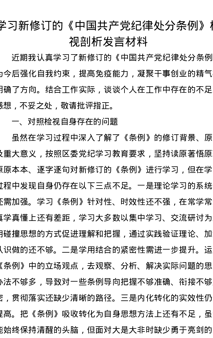 学习新修订的《中国共产党纪律处分条例》检视剖析发言材料