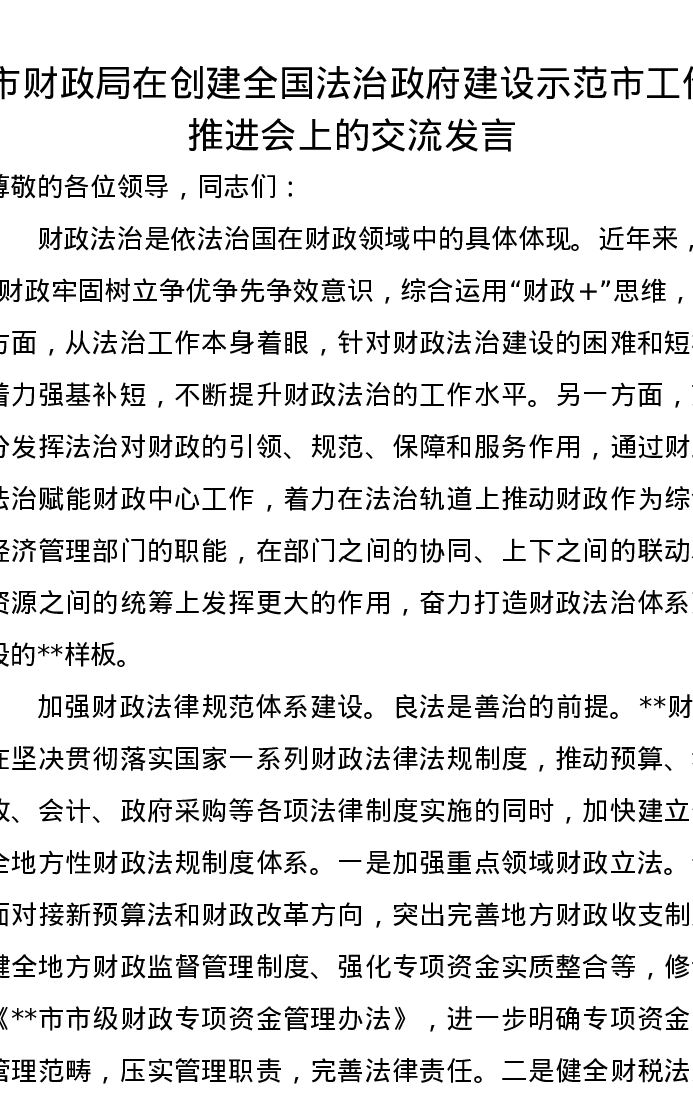 市财政局在创建全国法治政府建设示范市工作推进会上的交流发言