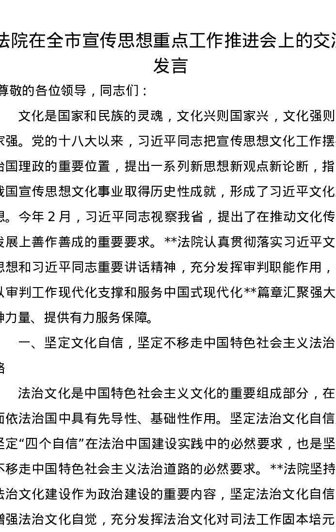 法院在全市宣传思想重点工作推进会上的交流发言