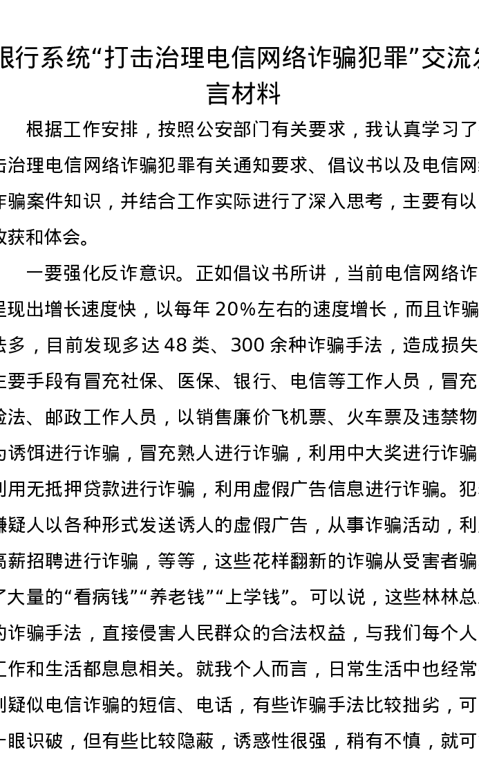 银行系统“打击治理电信网络诈骗犯罪”交流发言材料
