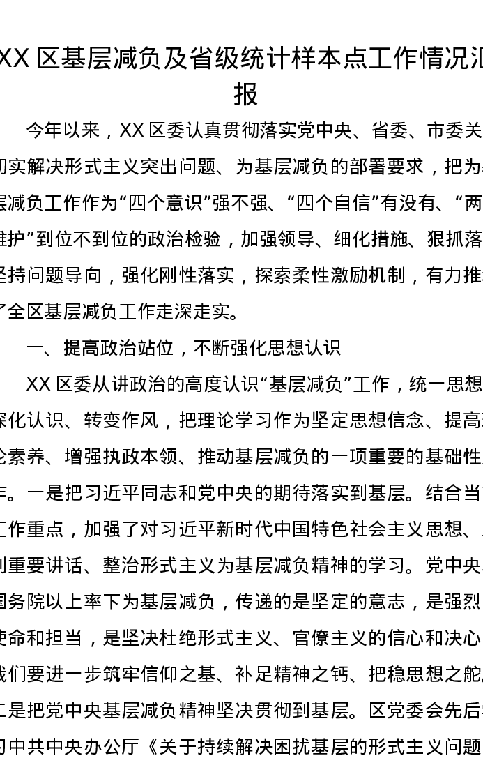 XX区基层减负及省级统计样本点工作情况汇报
