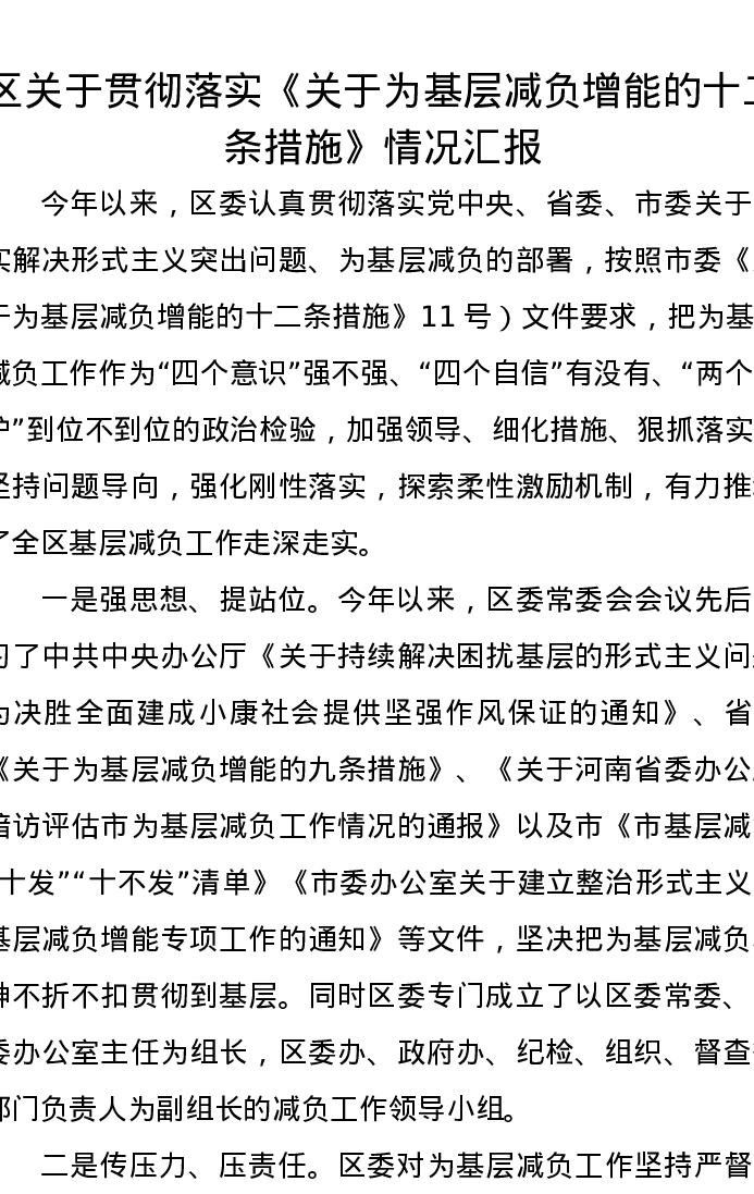 区关于贯彻落实《关于为基层减负增能的十二条措施》情况汇报
