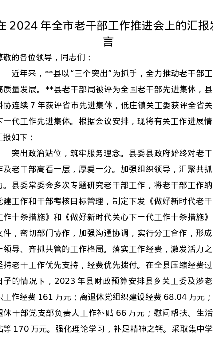 在2024年全市老干部工作推进会上的汇报发言