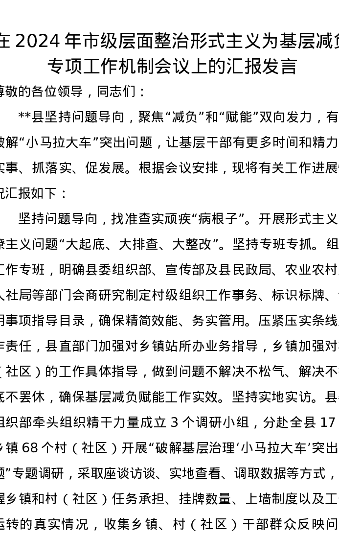 在2024年市级层面整治形式主义为基层减负专项工作机制会议上的汇报发言