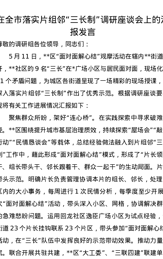 在全市落实片组邻“三长制”调研座谈会上的汇报发言