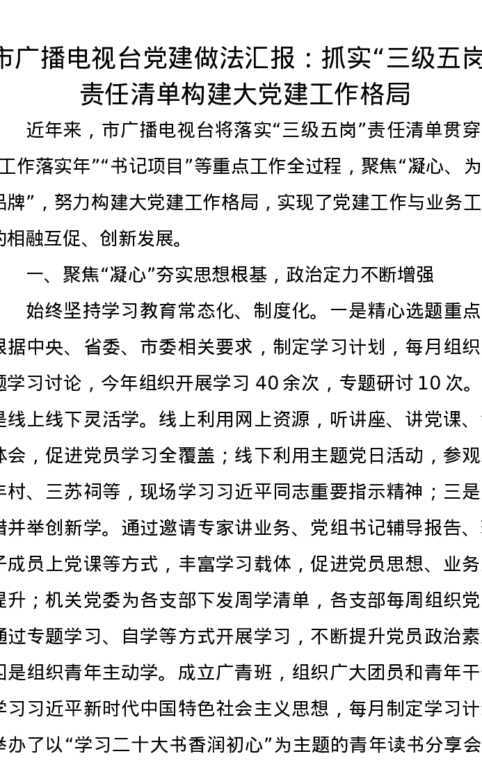市广播电视台党建做法汇报:抓实“三级五岗”责任清单构建大党建工作格局