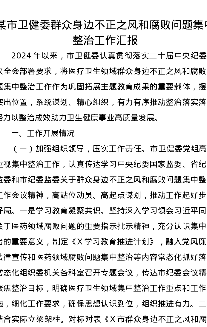 某市卫健委群众身边不正之风和腐败问题集中整治工作汇报