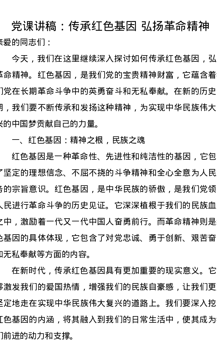 党课讲稿:传承红色基因弘扬革命精神