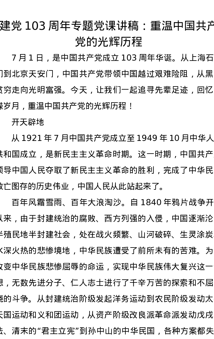 建党103周年专题党课讲稿:重温中国共产党的光辉历程