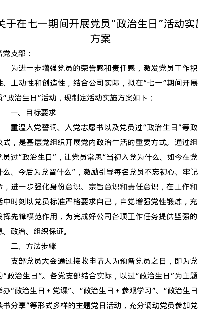 关于在七一期间开展党员“政治生日”活动实施方案