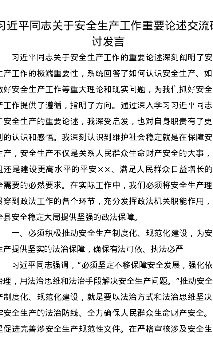 习近平总书记关于安全生产工作重要论述交流研讨发言