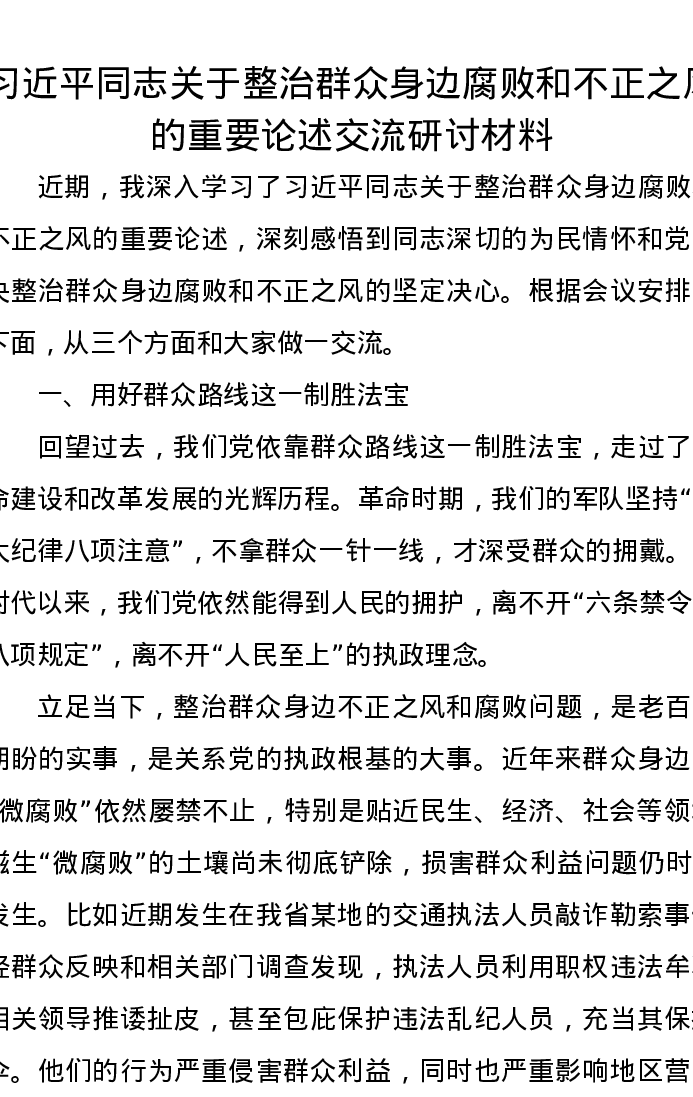 习近平总书记关于整治群众身边腐败和不正之风的重要论述交流研讨材料2