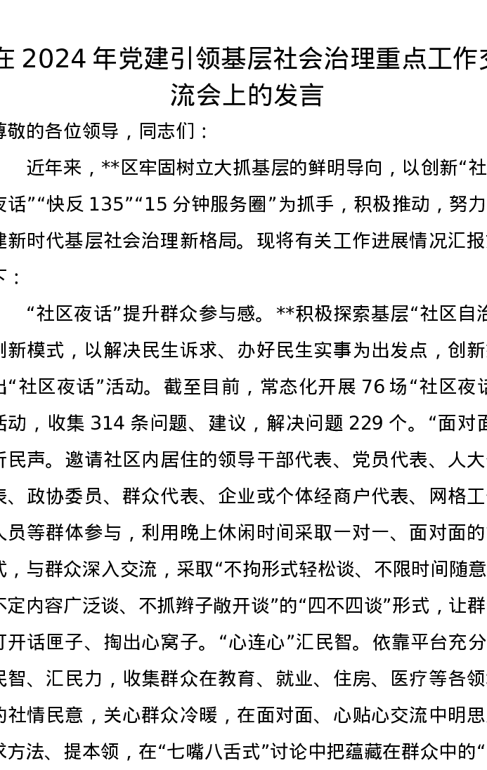 在2024年党建引领基层社会治理重点工作交流会上的发言