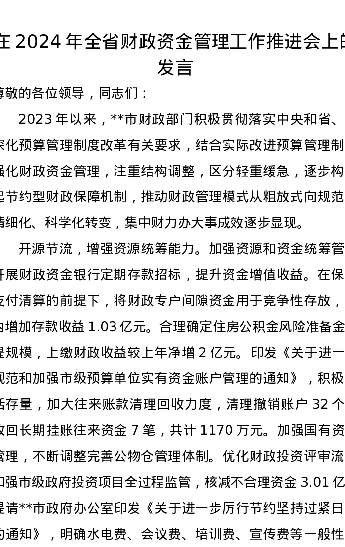 在2024年全省财政资金管理工作推进会上的发言