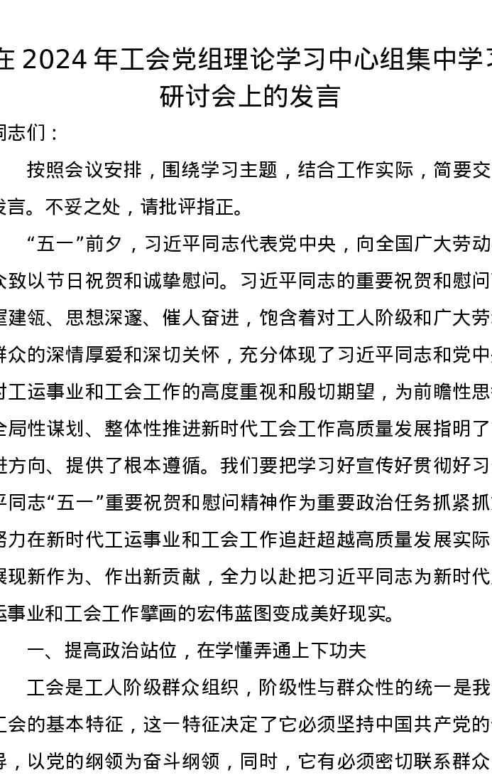 在2024年工会党组理论学习中心组集中学习研讨会上的发言