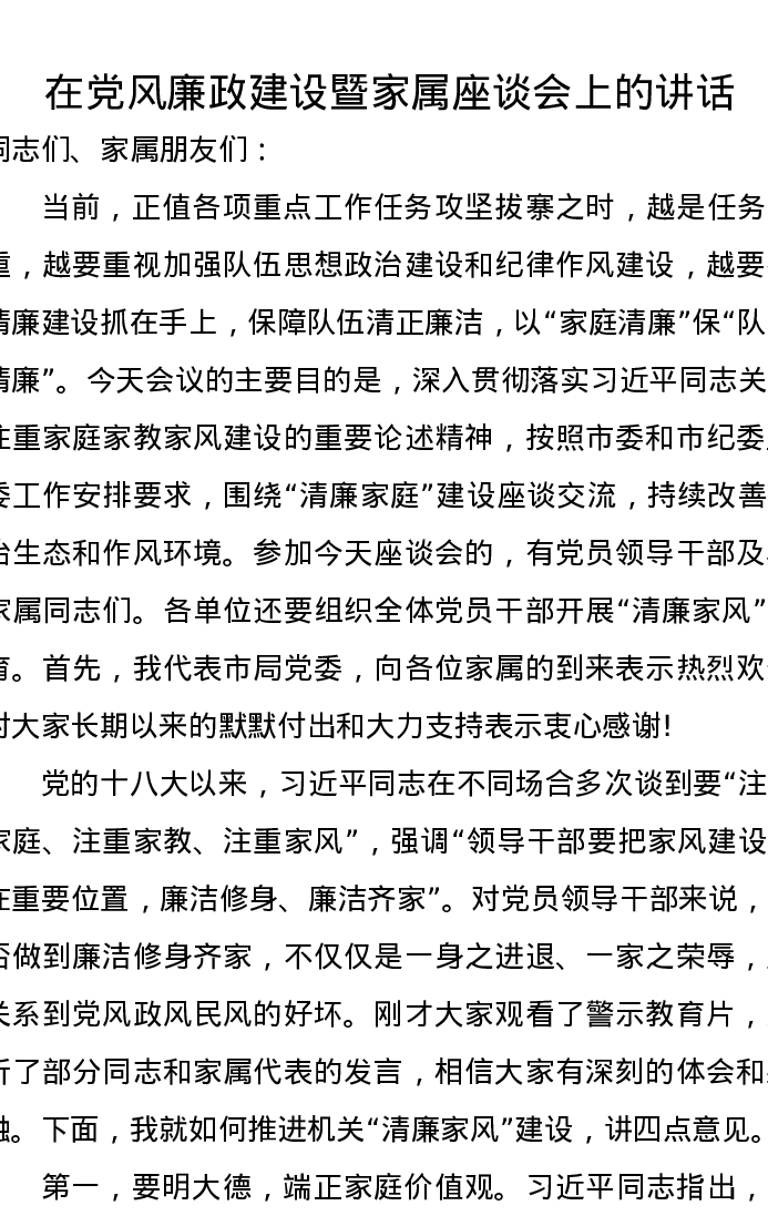 在党风廉政建设暨家属座谈会上的讲话