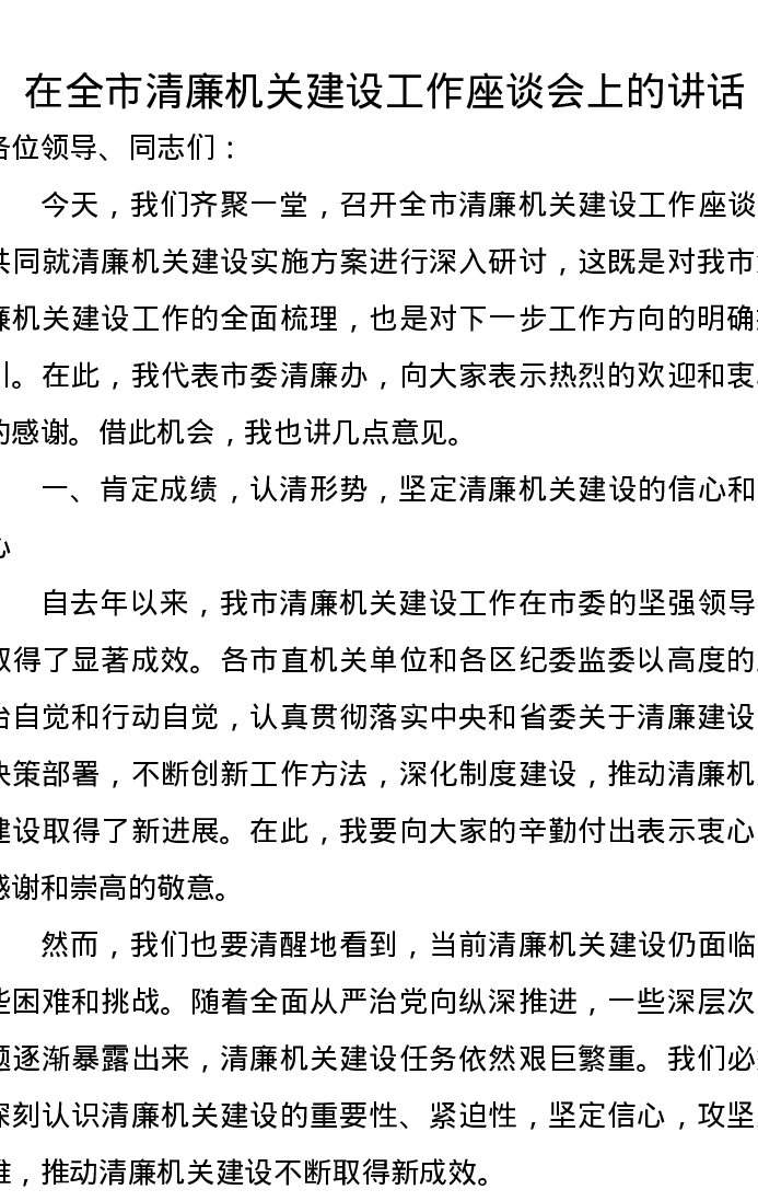 在全市清廉机关建设工作座谈会上的讲话