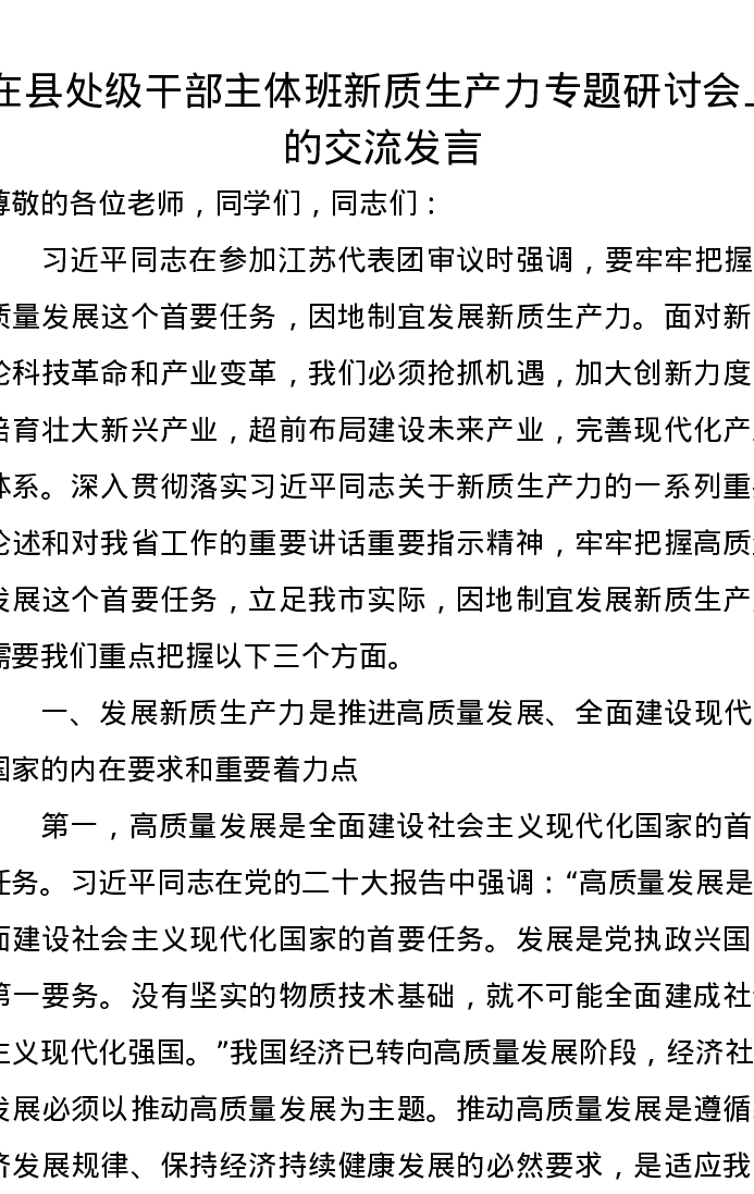 在县处级干部主体班新质生产力专题研讨会上的交流发言