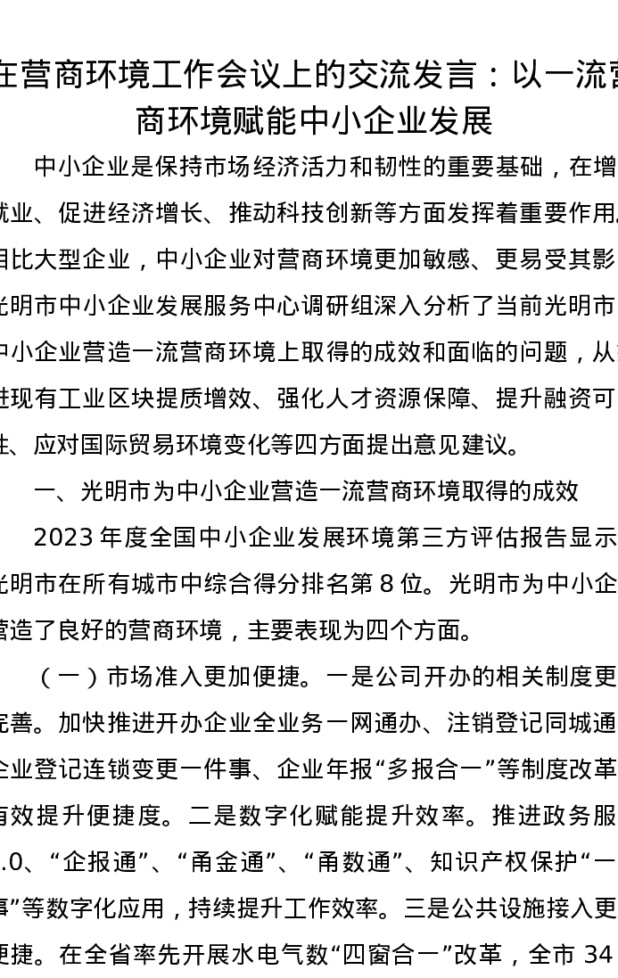 在营商环境工作会议上的交流发言:以一流营商环境赋能中小企业发展