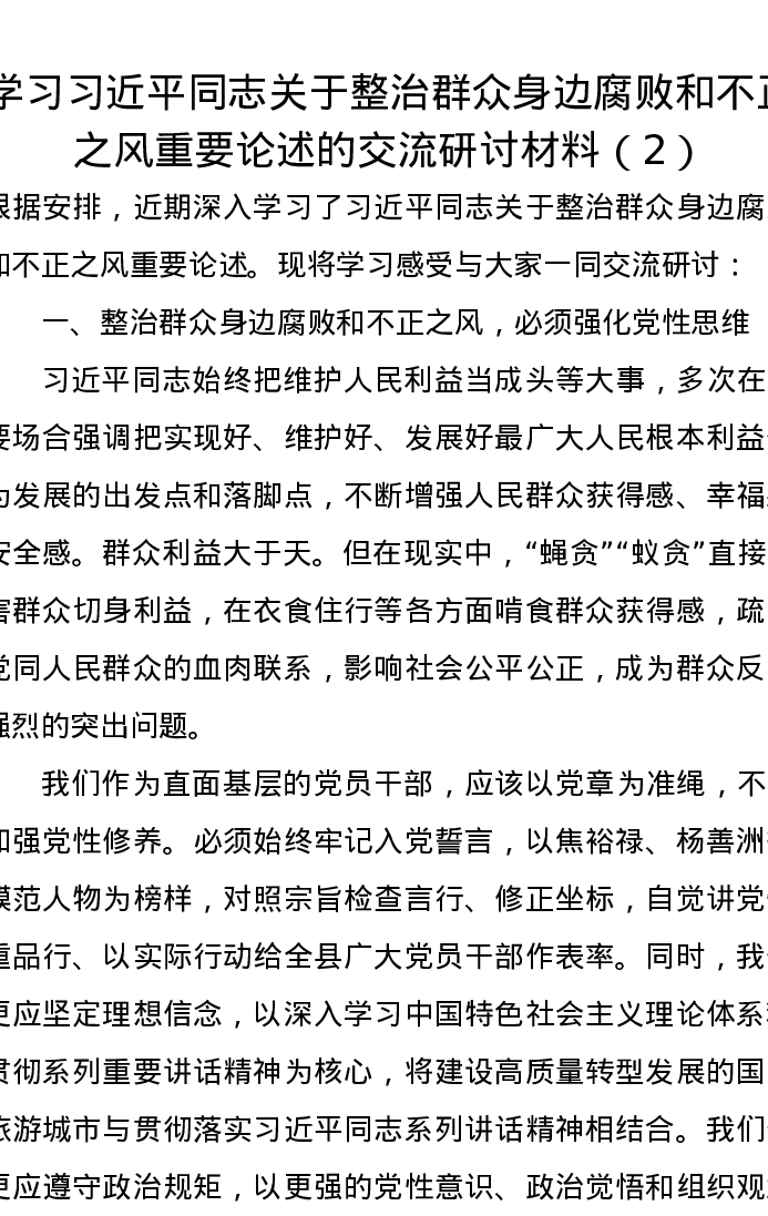 学习习近平总书记关于整治群众身边腐败和不正之风重要论述的交流研讨发言材料(2)