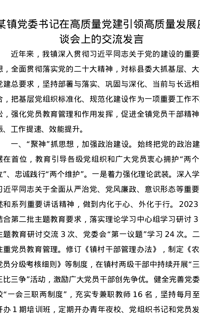 某镇党委书记在高质量党建引领高质量发展座谈会上的交流发言