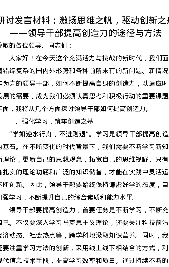 研讨发言材料:激扬思维之帆,驱动创新之舟——领导干部提高创造力的途径与方法