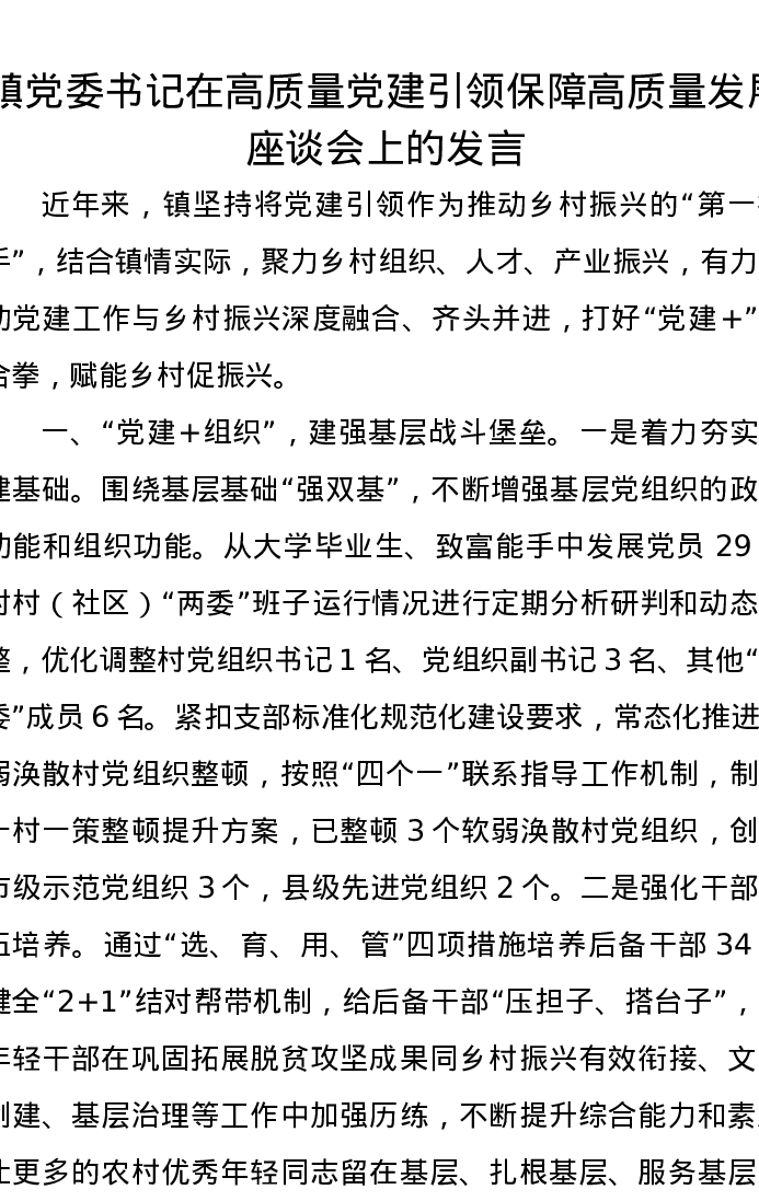 镇党委书记在高质量党建引领保障高质量发展座谈会上的发言