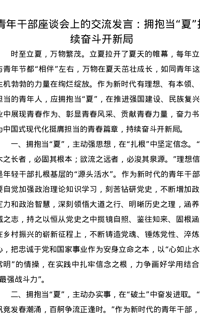 青年干部座谈会上的交流发言:拥抱当“夏”持续奋斗开新局
