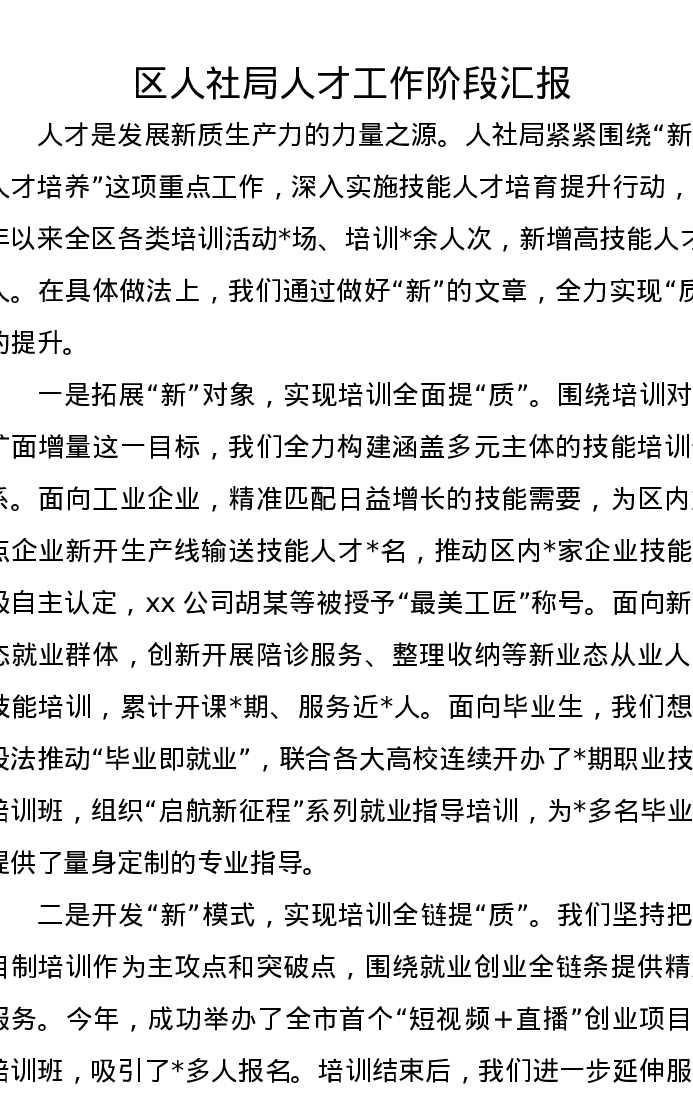 区人社局人才工作阶段汇报